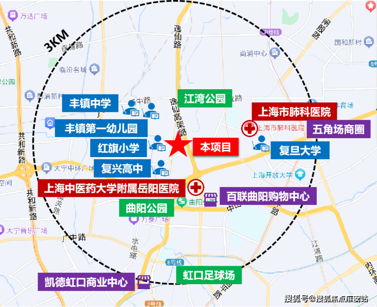 虹口江湾镇板块是宝山、静安、虹口、杨浦四区交界处,板块自身配套相对一般,但“左邻右舍”都比较热闹: