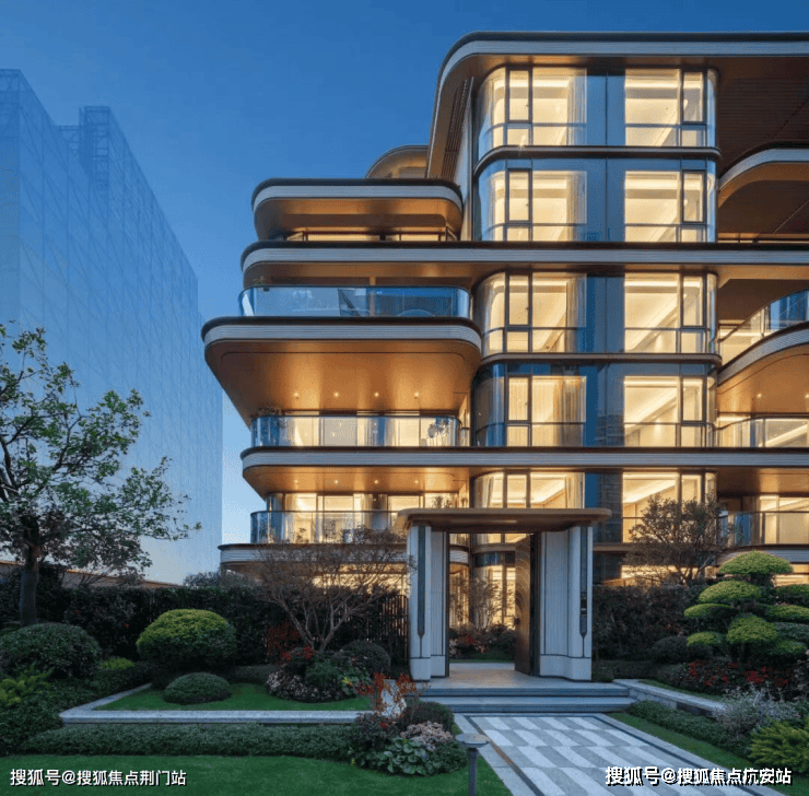 天澜传序府的外立面,用古铜金的铝板、「全面屏」般的大幅玻璃,还有钱塘江潮般的弧形曲线,搭配出了超强的精致度。这样的叠墅颜值,放在今年的杭州,都首屈一指。