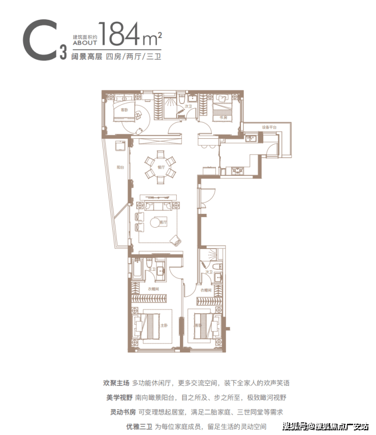 四房间呈四叶草布局分布于户型四角,互不打扰;