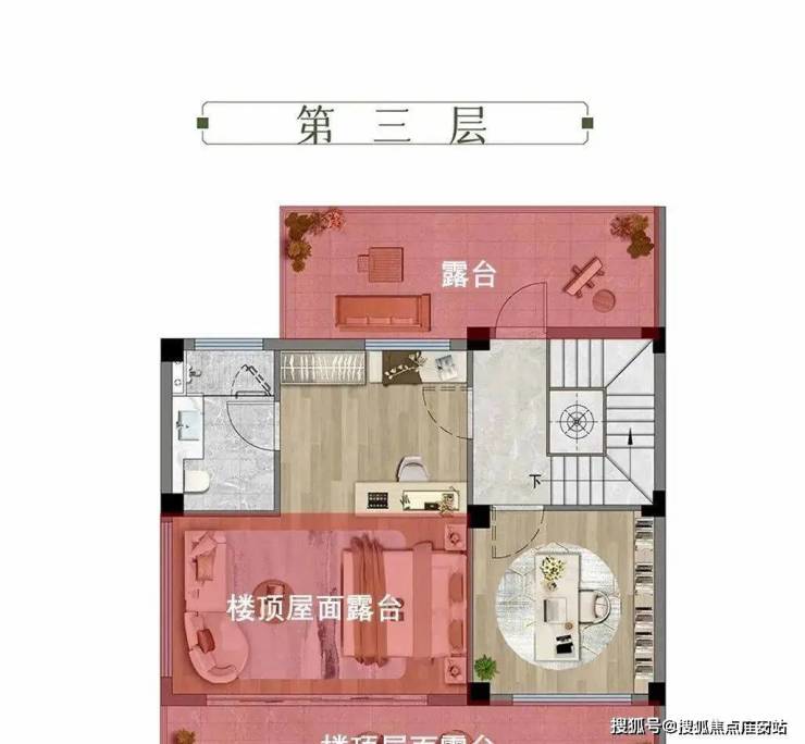 三层,整层套房设计。该层赠送约23㎡的南北双向大露台,这里作为建筑的“空中延伸空间”,兼具视野开阔、采光充足的优势,无论是打造成亲近自然的露台卧室,还是多功能的生活场域,都能极大提升居住体验。