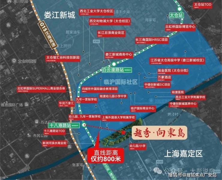 越秀·向东岛位于上海嘉定区与太仓市交界处,南门为上海嘉定区、北门为太仓娄江新城,拥有上海新和路1558号和太仓富达路1号双城门牌号,生活半径归于上海。