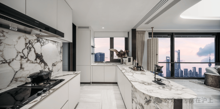 约270°环幕大边厅尺度感十足!高区直面陆家嘴城市天际线+黄浦江景观,视野相当震撼!中厨+西厨岛台、客餐厅+阳台面积近约53㎡,不失为一个超棒的家庭休闲空间!