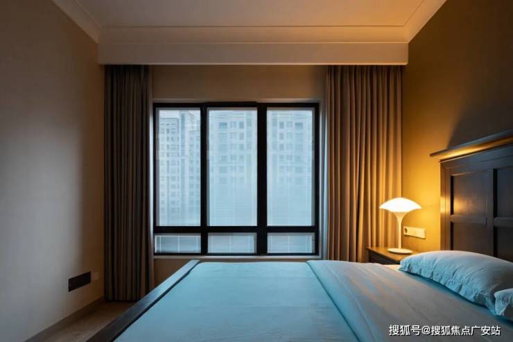 灰咖色的墙面空间与窗帘,在床头柜摆一张暖色调的台灯,让父母房满屋都是朴素的温馨感。