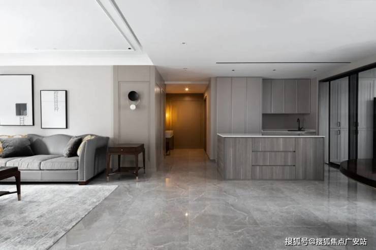 客厅空间整体灰色调的地面基础,天花简洁的吊顶加入无主灯设计,带来一个现代优雅的大气空间感。