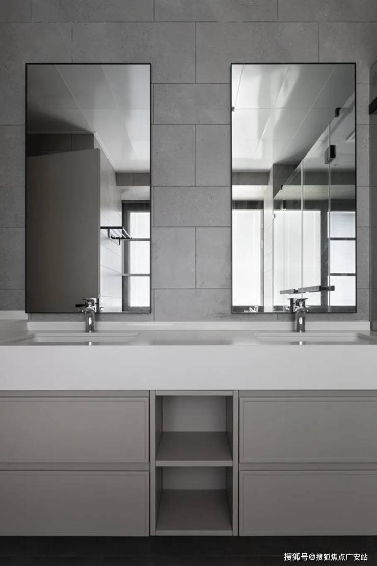 双人位的洗手盆,灰色的墙面空间,结合灰色洗手盆柜,两个洗手盆之间的台面下加入开放格架,也带来了一个灵活的卫浴收纳。