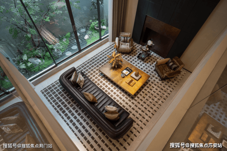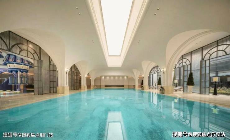 地下恒温泳池三面采光,顶部是15米玻璃天顶倒映着空中花园水景,泳池底部300万片马赛克拼出名画《睡莲》局部。两侧黑色铁艺屏风外是下沉庭院,让业主在游泳的同时也可看到外部的自然景观。