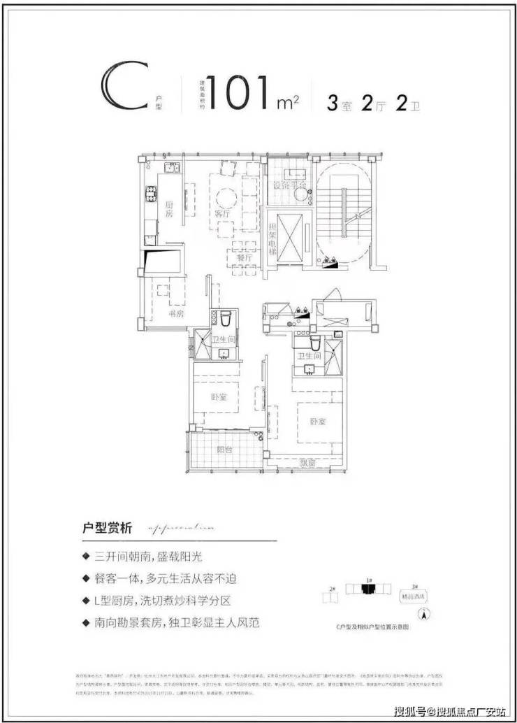 建面约101平方米的户型设置为3室2厅2卫,主卧为套房,卧室面积约17.3平方米,室内可放置一张1.8米大床,另添婴儿床也不显拥挤。主、次卧开门处,走道设计恰到好处,既能充分利用空间,又能满足日常刚需。