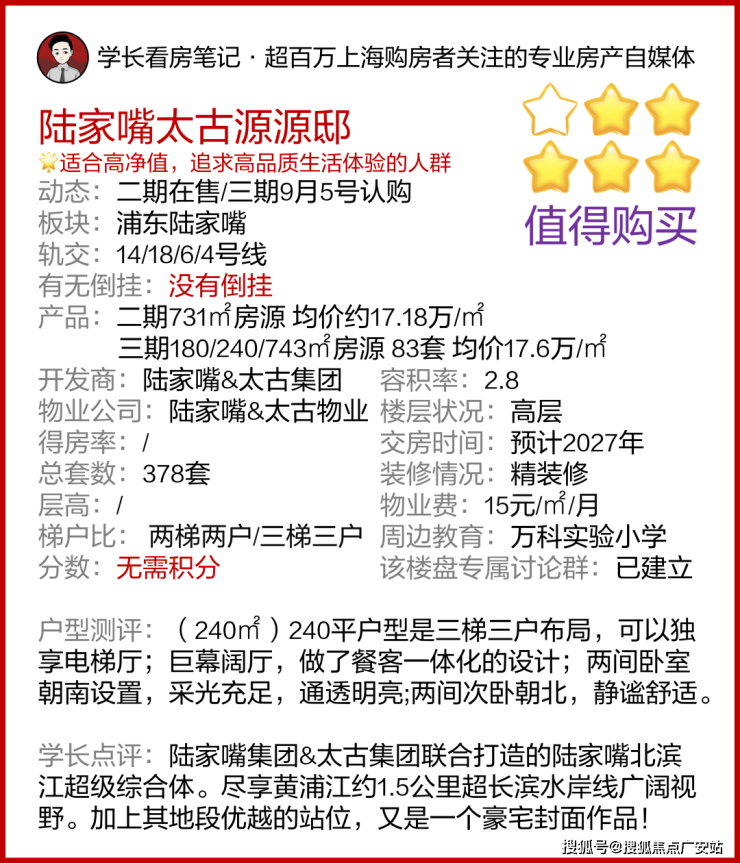 最新消息,北滨江「陆家嘴太古源源邸」三期9月5号认购!推出建面180-743㎡房源!