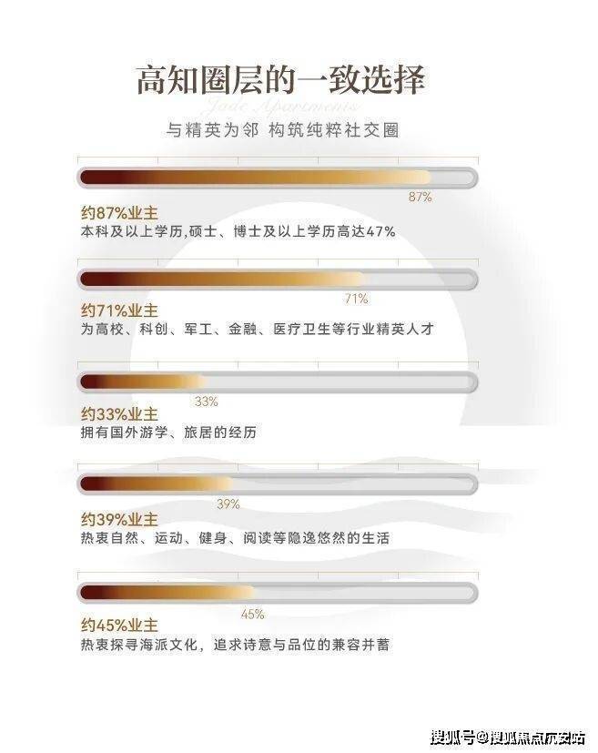 据统计,映江润府业主约87%为本科及以上学历,硕士、博士及以上学历高达47%!千金买房,万金买邻,像映江润府这样高比例的高知住区全市少有,而对于年轻的城市菁英们来说,无形的圈层代表着对社会资源的占有,决定着人生的高度。
