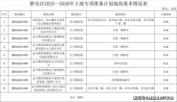 以2025—2026年为研究范本,静安区土地储备共有9宗地块,其中8宗位于大宁,1宗位于宝山路街道。