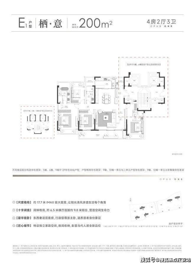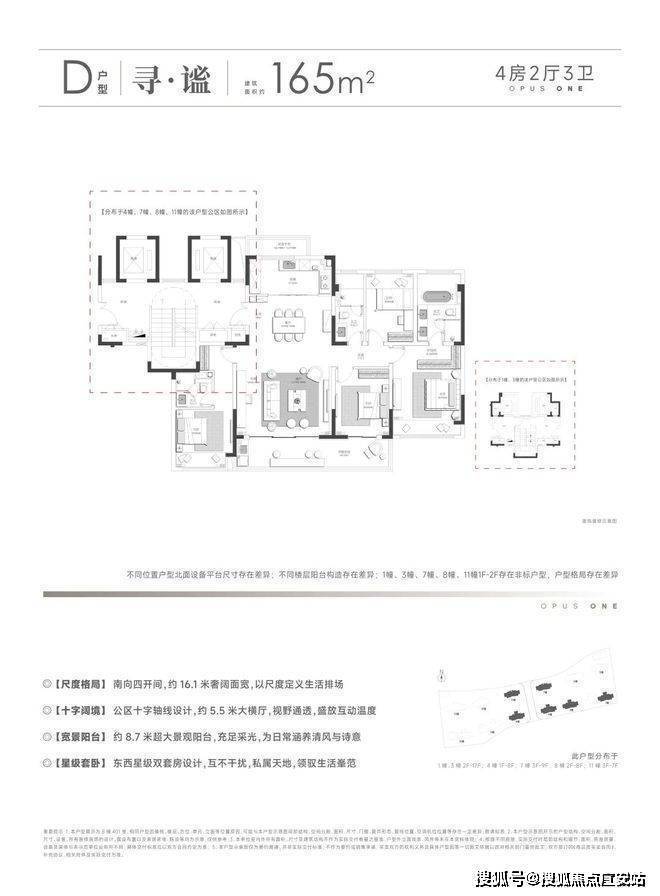 户型亮点:最大特色是超20米建筑面宽,阔境轴线设计,双套房布局(差异户型除外)。以165平方米户型为例,四开间一体朝南敞开,宽厅面宽约5.5米,采光和通透度优越。