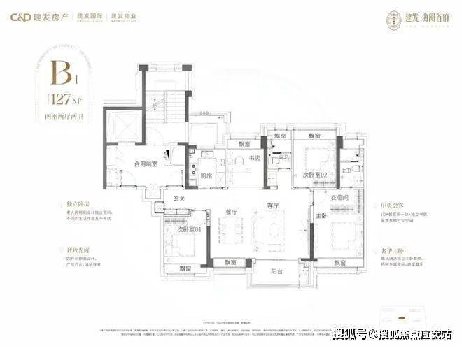 户型特色:96㎡三房两厅两卫户型,三开间朝南,LDKB一体化设计,全景飘窗,空间通透;141㎡四房两厅两卫户型,四叶草布局,约7.2米宽厅连接270°转角阳台,主卧套房含独立衣帽间及双台盆卫浴,私密性与功能性兼备。