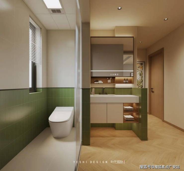 卫生间以白色+绿色为主色调,悬浮式洗手池利落划分干区,长方形智能镜柜以柔光点亮空间,大理石纹理墙面延伸通透质感。淋浴区以玻璃隔断实现干湿分离,窗户引入自然光,镜面收纳柜与嵌入式壁龛暗藏巧思,让日常盥洗成为沉浸式的美学仪式。