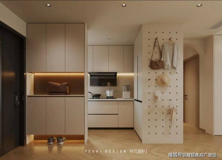 设计师非常注重空间的实用性和联动性,在餐厅区域采用了流动的设计手法,以入户玄关为为间隔,将厨房以半虚掩的形式加以呈现,同时,通过将不同材质、器具进行合理规划,将两个相互独立的区域进行了紧密相融,也将实用功能隐于美学构造中。