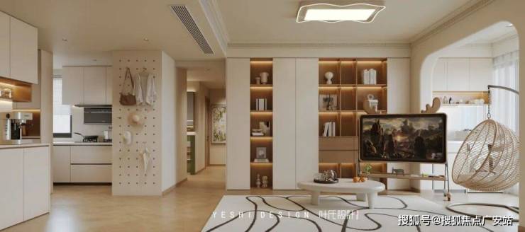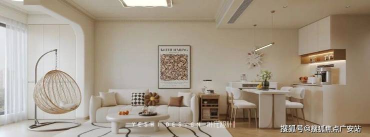 设计注重光影层次与动线流畅,通过开放式布局提升空间开阔感,动线通达、惬意相欢,简约吊灯温润了空间的疏离感,竹编镂空吊椅赋予了生动的功能联动,奶白色沙发实现美观与功能的平衡,也构建起整个客厅的温柔基底。