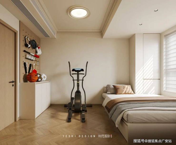 次卧静谧而优雅,浅木地板衔接奶白墙面,半截收纳柜线条干净利落,上方的小钉板上悬挂着主人最爱的健身器材,与旁侧的椭圆机遥相呼应。次卧床铺临窗,床上饰品不多,设计师用简洁的设计语言,解锁更加精简的生活方式。