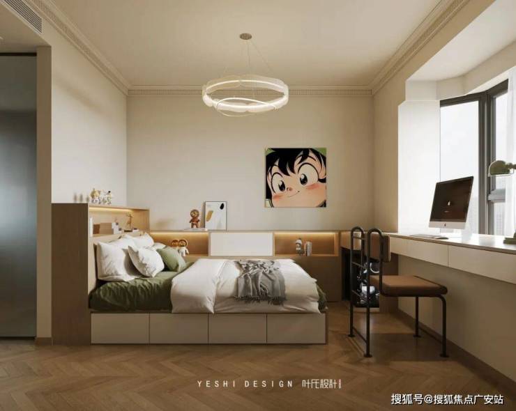 归家即归心,主卧以柔和色调为主旋律,米色的墙面营造出宁静氛围,与雅致的木色地板相拥。空间设计注入了细腻巧思,墙上充满童趣的可爱挂画、垂坠的水晶吊灯,都在这静谧的空间里,晕染出松弛又高级的氛围,每一处别具一格的细节,都藏着让心沉淀的温柔魔法,是疲惫时最想奔赴的栖息角落。