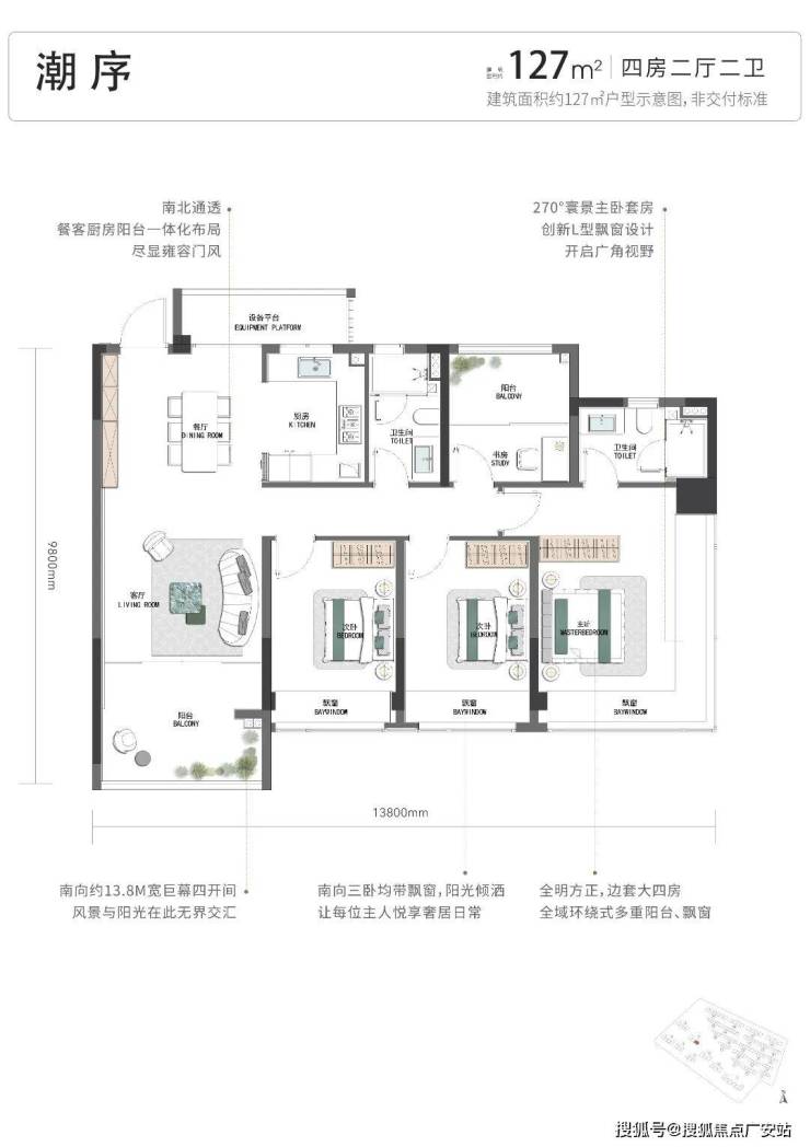 再来看项目的四房户型,有建面约127方、约130方2款。控总价的建面约127方:这款户型的每一点巧思,统统都是豪宅标准:LDKB的户型设计;封包阳台+3卧室均带飘窗;南向超大开间;