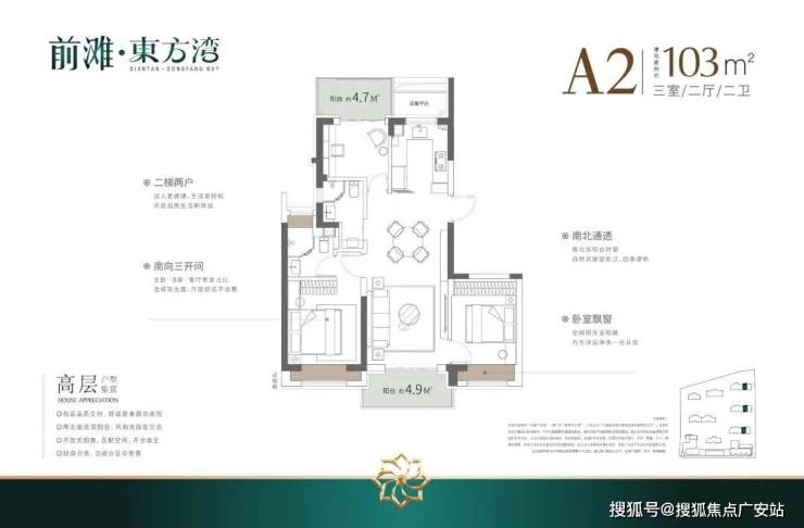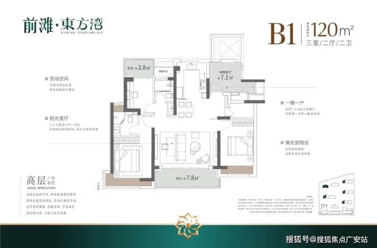 空间利用率高:层高最低3.1米,高于市场标准;双阳台设计增加使用空间;南北贯通LDKB布局,提升公区通透感