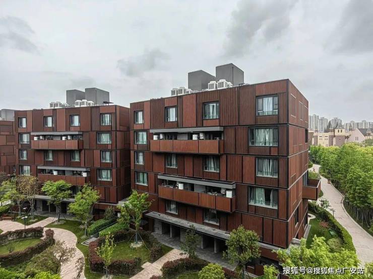 沁风雅苑一共由18栋6层的叠加组成,整体呈倾斜镜像状排列,外立面采用木色调,风格极为独特。