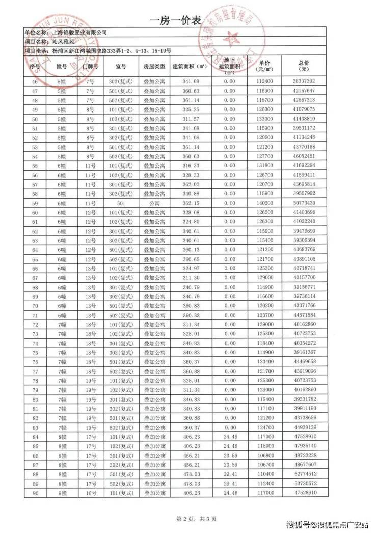 项目一房一价表: