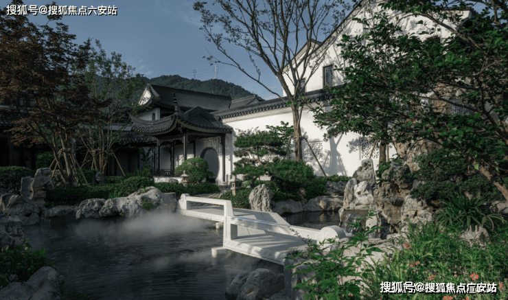 江南园林甲天下,苏州园林甲江南,比如像我们现在看到的园林布局,就是经典的苏州园林景观,讲究引水入园。造景围绕着这片水景展开,空间上比较有层次感。近景是流水、堆石,中景是连廊、假山,远景是中式合院的院墙、屋檐。