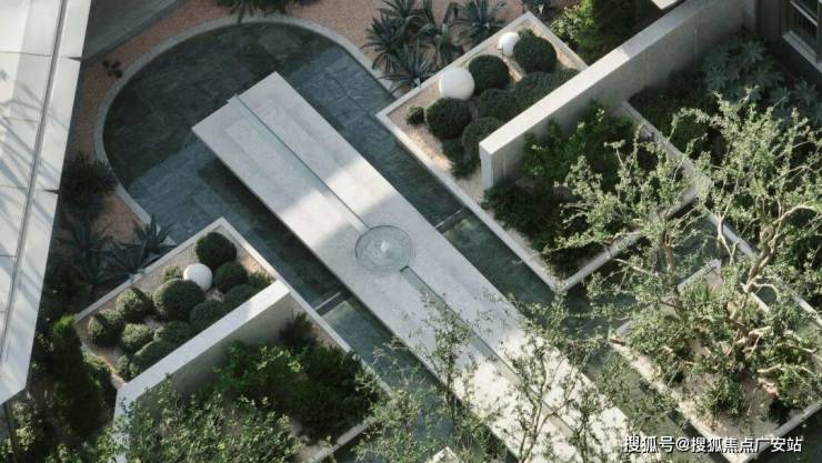 绿宝石花园以莫奈《睡莲》为灵感,打造约30米长的水景花园;林间溪谷则采用椭圆水池设计,汲取克罗耶《斯卡恩的夏日傍晚-海滩散步》的艺术意境,营造水景与休憩空间的交互体验;城市露台位于6号楼下,面向中兴公园,异域植物环绕的阶梯提供从高向低的景观视野,塑造城市与自然的层次感。