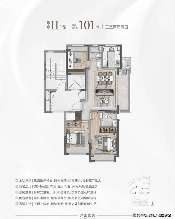 H户型:瞰·见建筑面积约101㎡,三房两厅两卫