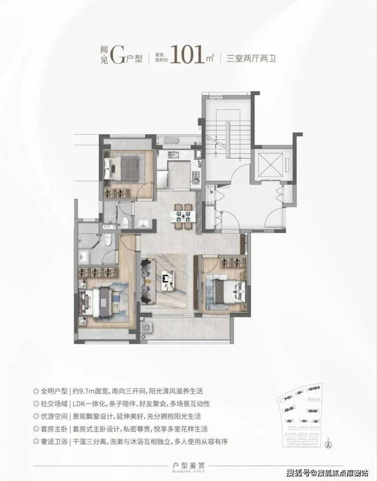 G户型:阅·见建筑面积约101㎡,三房两厅两卫
