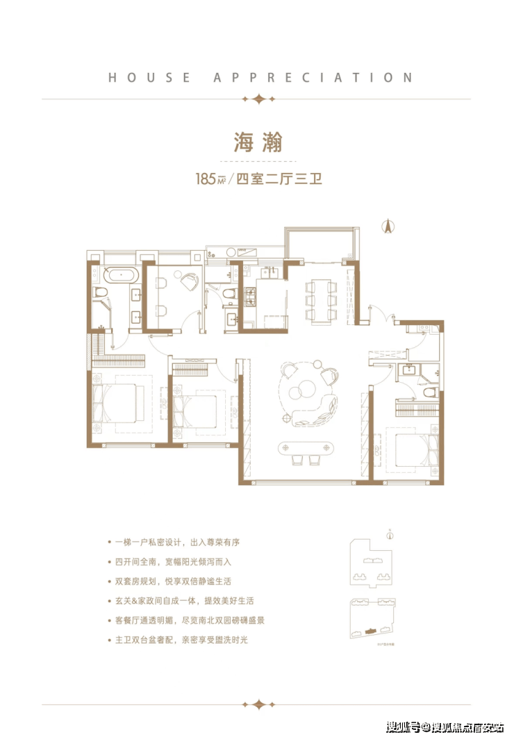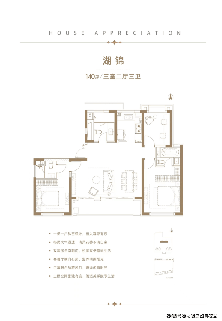 2)三个房间三个卫生间,南向双套房设计,符合高端人群的卫生要求。