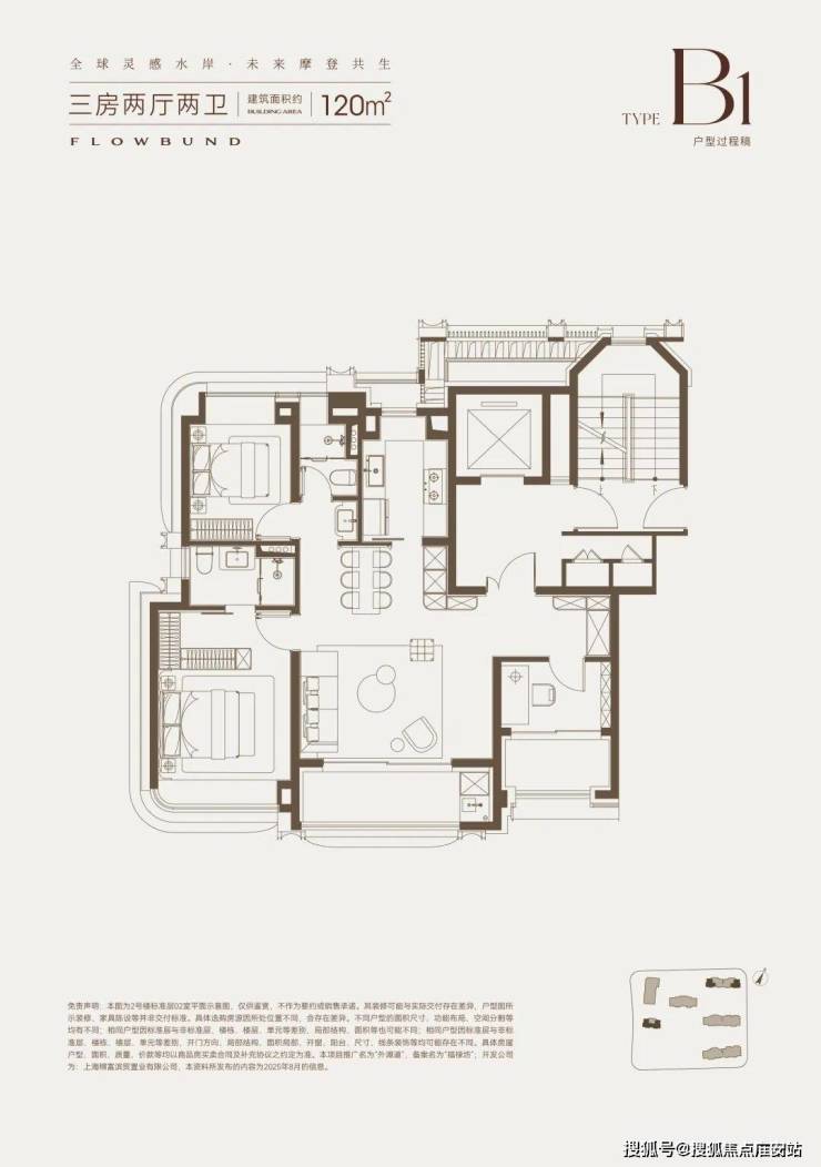建面约120㎡的大横厅、双阳台产品,并没有勉强去做4房,而是打造了一个超宽绰的3房产品。