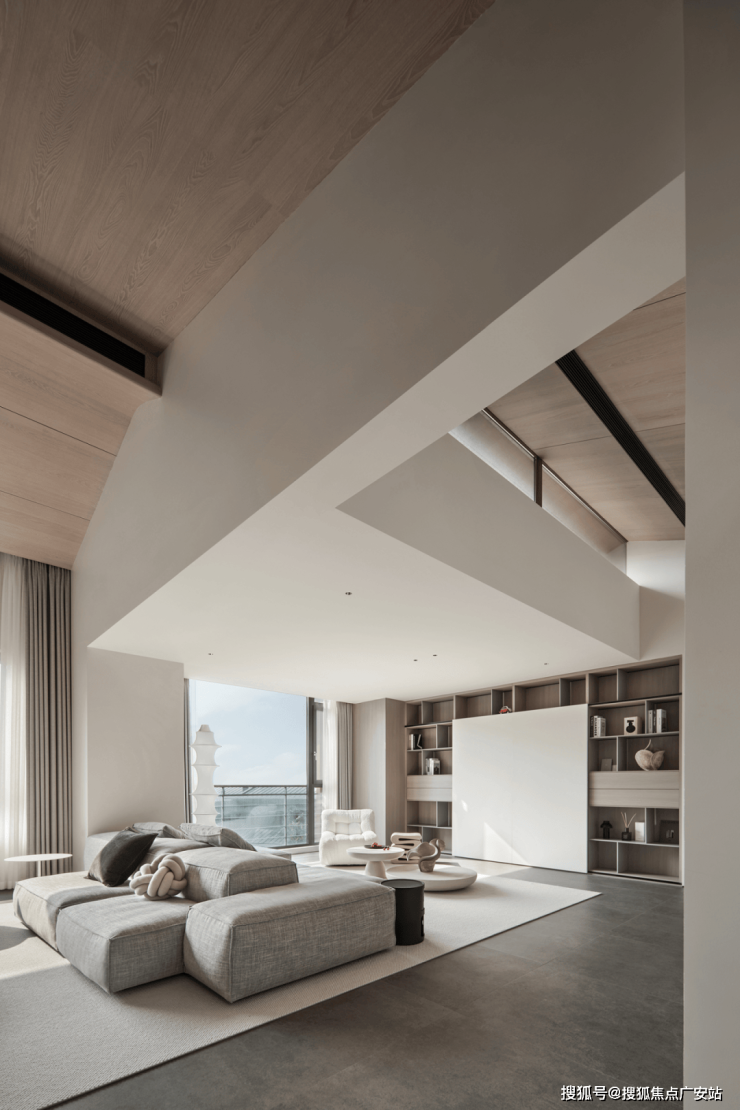 坡形顶的设计不仅提高了空间的视觉高度,也增加了空间的层次感和个性化艺术美感。通过巧妙隐藏空调风口等设备,整体空间变得简约干净。