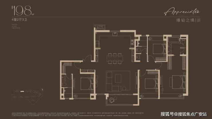建面约172㎡4房户型,多娃家庭的进阶之选!奢阔尺度尽显家族气度!2梯2户, 子母双开门礼序入户,私密尊崇门厅;约16米四开间朝南,搭配约6米尺度横厅,揽四时风景入怀。
