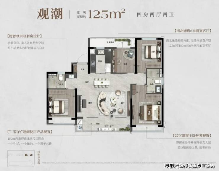 建面约125㎡全能四房=双套房+超6米客厅+可变五房
