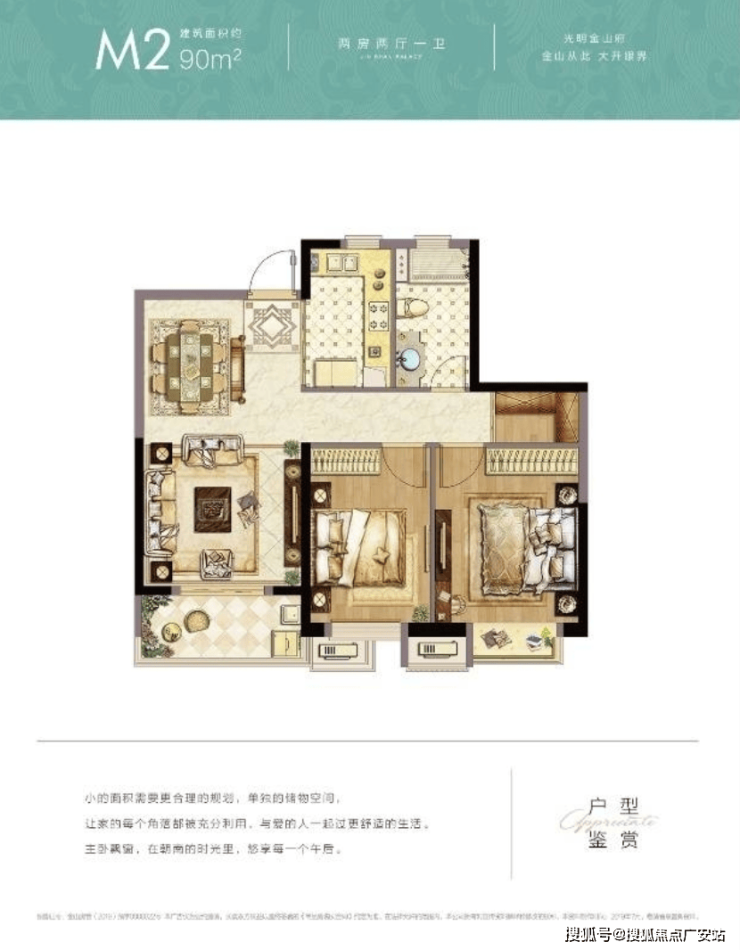 建面约90㎡2房2厅1卫,两间卧室朝南,舒适尺度搭配观景阳台,干湿分离的独立卫浴。