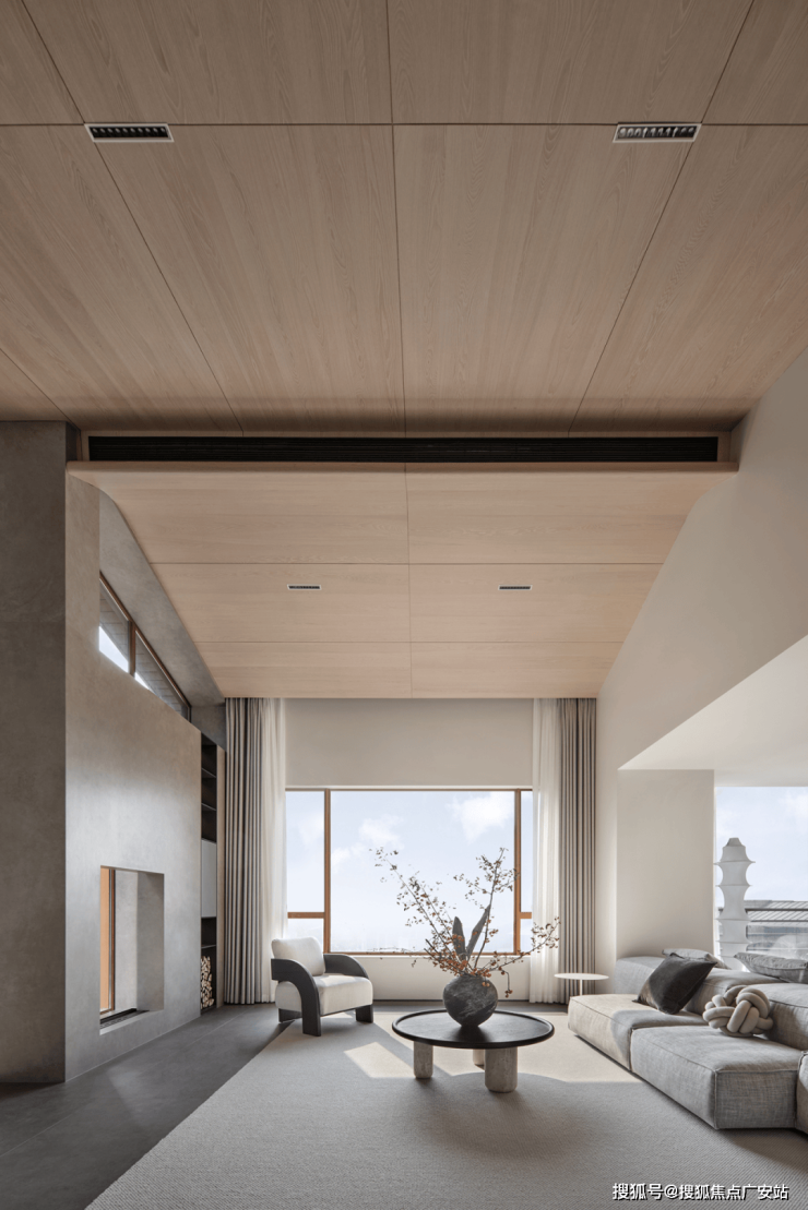 坡形顶的设计不仅提高了空间的视觉高度,也增加了空间的层次感和个性化艺术美感。通过巧妙隐藏空调风口等设备,整体空间变得简约干净。