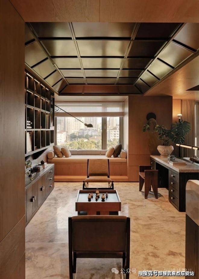 而与之相连的“珍宝阁”书房,打破传统封闭式展陈逻辑,与客厅联动,空间设计以“打开的行李箱”为隐喻,打造无界收藏馆。