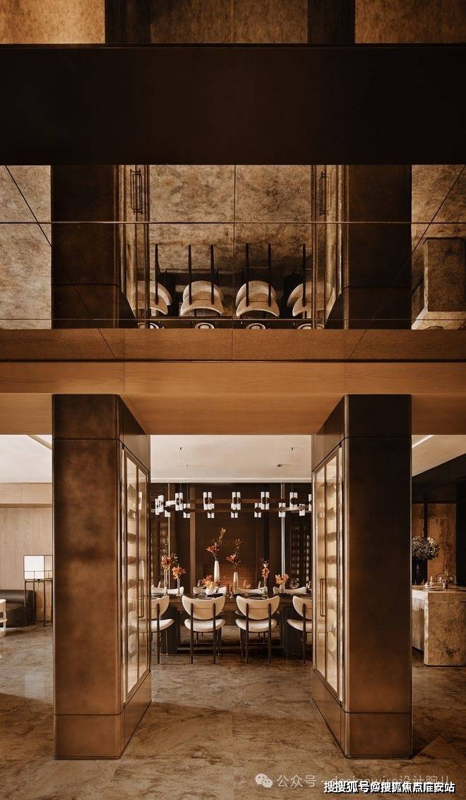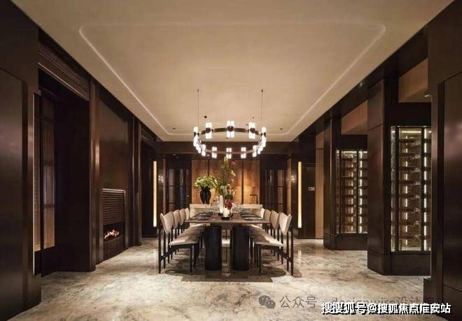 而客餐厅有着别致而深沉的质感,餐边柜✨✨✨【万科中兴傲舍】售楼处热线预约:400-865-7114✔✔✔❤❤❤墙面采用仿古铜不锈钢,配合壁炉燃起,长餐桌与圆轨吊灯在方圆间见气度,令人安心的聚谈随光行进。