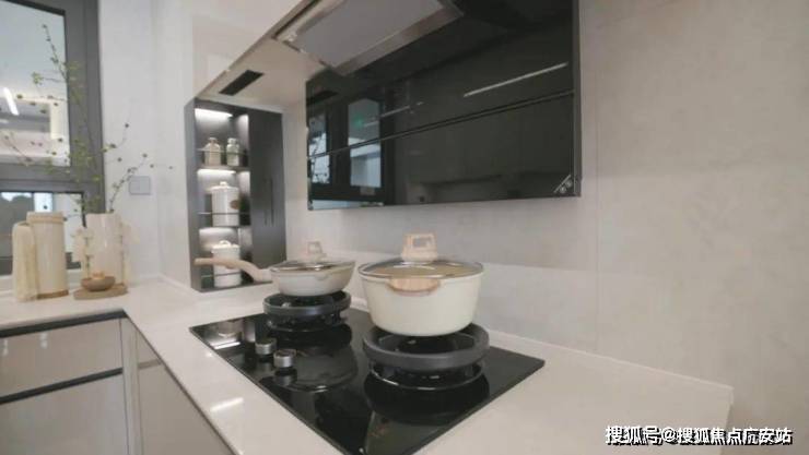 这里还藏着7大智慧收纳空间,橱柜采用浅灰高光PET平贴面板,更加方便清洁。柜内设置了升降拉篮+多功能调味拉篮+谷物抽+碗碟拉篮,更是充分利用了厨房飘窗打造了操作台面及抽屉,将操作空间及收纳空间进一步放大。灶台旁同样打造了开放式网格收纳空间。