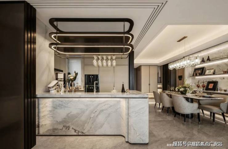 厨房与餐厅打造半开放式格局,隐形推拉门既可以隔绝烟火,平时收入墙内让空间一体、开阔大气。