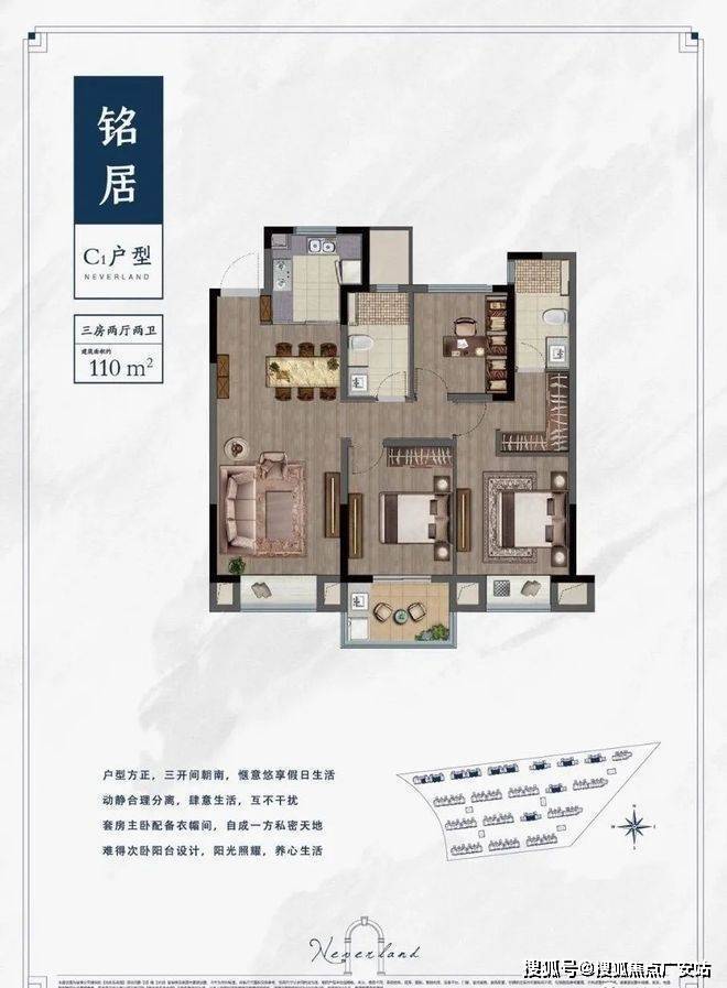 110㎡的三房两厅,相比上两个户型来的更为方正,三开间朝南,套房主卧带衣帽架,次卧难得拥有大阳台,采光效果可谓一流!