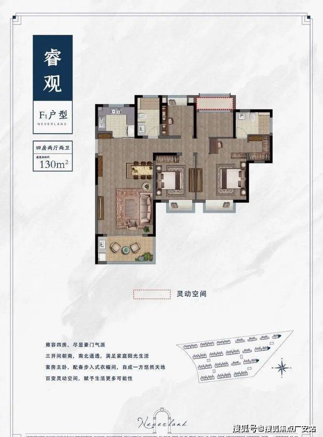 有点像手枪型的户型,客厅带有景观阳台,采光和通透性都会更好,百变的灵动空间,给居住者更多打造想象的空间~