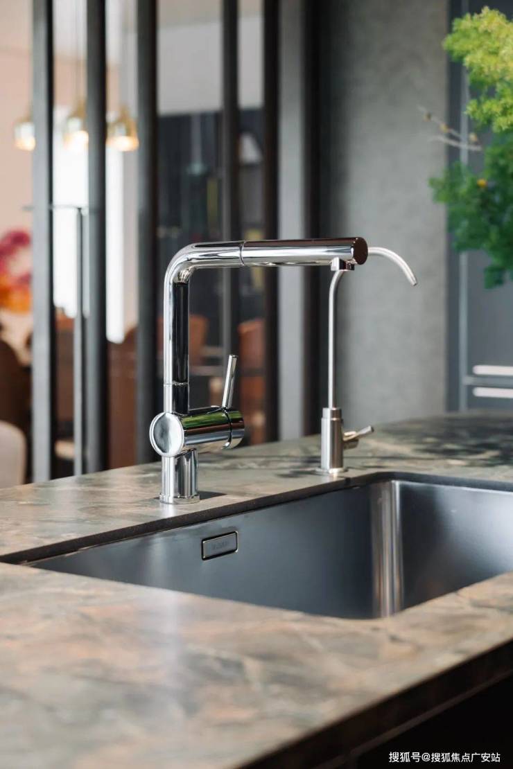 西厨岛台选用亚马逊绿岩板打造,搭配金属质感推拉门,高审美艺术性表现力满分!