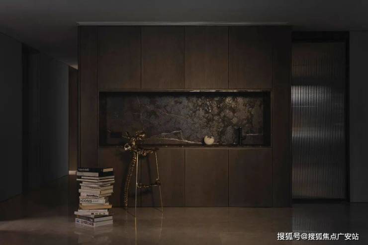 再比如墙面,该样板房的电视背景板融入了整块玉石作为背景墙,典雅庄重,体现了业主的不凡品位,这种大手笔一般在千万级豪宅项目上才能看到。
