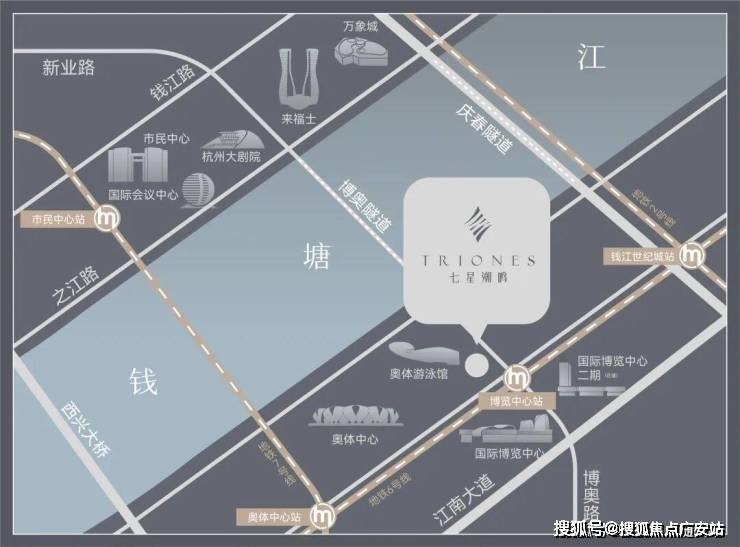 七星潮鸣享有TOD上盖交通优势,地铁6号线博览中心站上盖,30分钟直达火车东站、萧山机场。项目周边形成“三隧双轨”路网,博奥隧道、庆春隧道、望江隧道10分钟直抵钱江新城。
