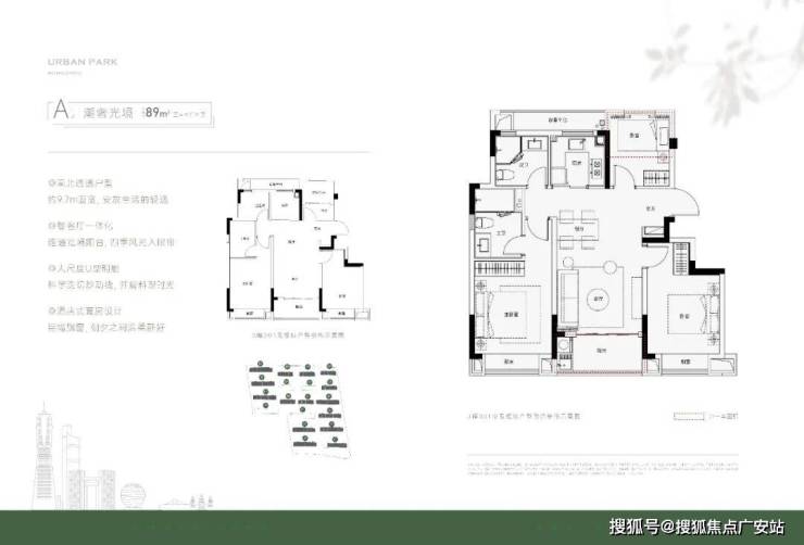 主力户型:89㎡三房两卫、117㎡四房两卫,南北通透,得房率约 90%。
