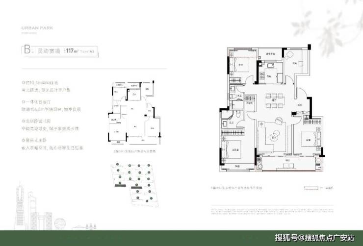 如果预算允许,可以直接117方四房改善。建面约117方四房两厅两卫户型,为标准的四叶草布局,空间尺度更为阔绰。三开间朝南面宽达到了约10.4米,客厅与次卧贯通的长阳台近6.8米长,不仅通风采光更好,也为晾晒、花草养护等提供了更多的生活情趣。