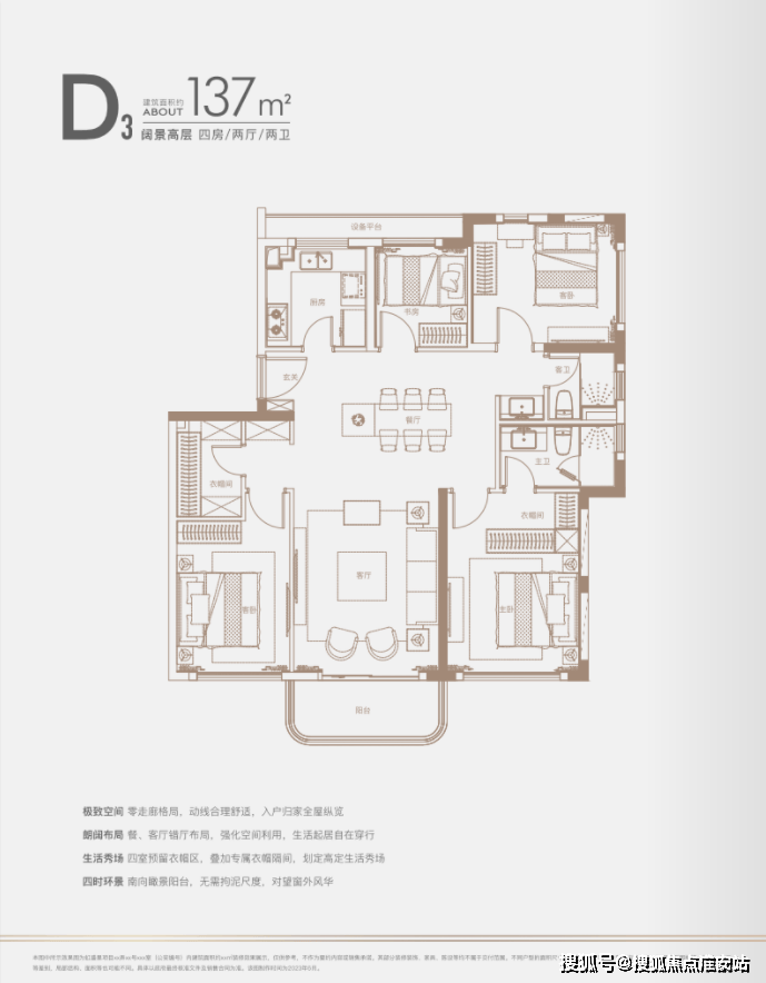 建面约140㎡四房:三开间朝南户型,南北通透,采光条件优质,客厅明亮宽敞,彰显大气布局。
