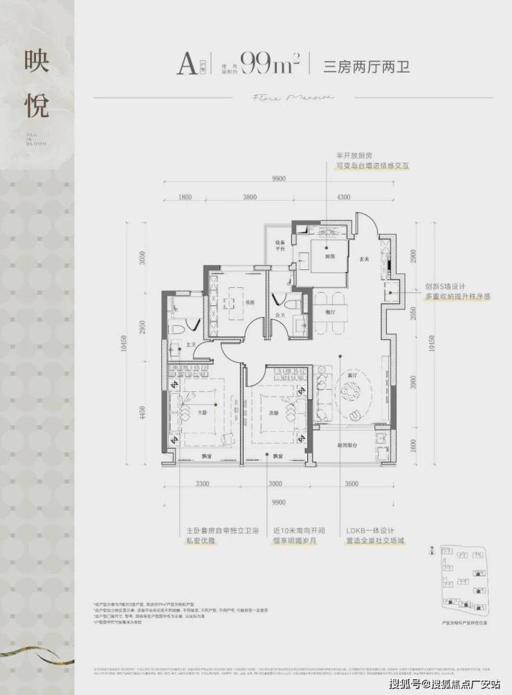 该边套户型,不仅有270度的采光视野,主/次/客卧三大开间并立朝南,“含阳光量”十足。