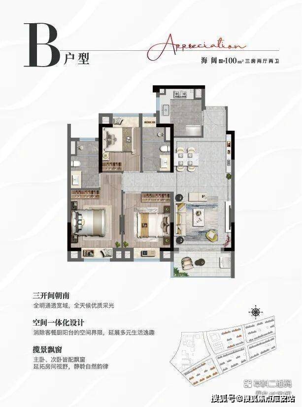约100㎡三房两卫:进阶改善起点。三开间朝南,双卧飘窗,主卧套房设计,宽景阳台引景入室,功能性与舒适度完美平衡。